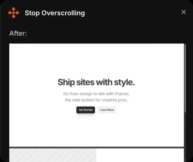 Our plugin injects a small, efficient script into your Framer project that sets the overscroll-behavior to "none". This simple change prevents the annoying bounce effect that occurs when users scroll past the top or bottom of the page.