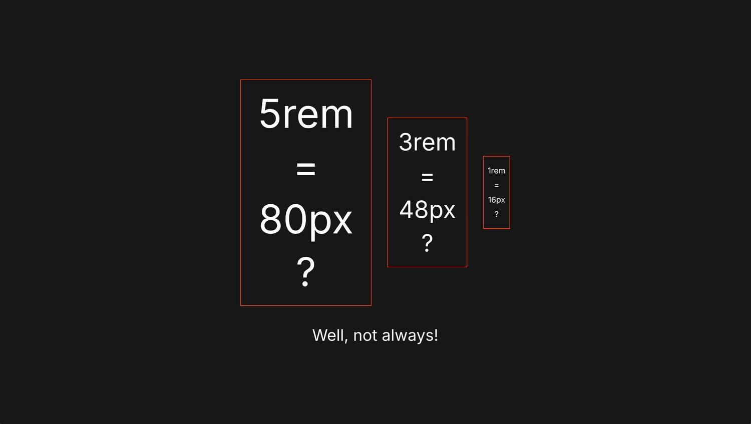 In CSS, rem stands for “root em” — a unit of measurement that represents the font size of the root element. This means that 1remequals the font size of the <html> element, which, in most browsers, has a default value of 16px. Doing some pretty basic math, here's what we get: